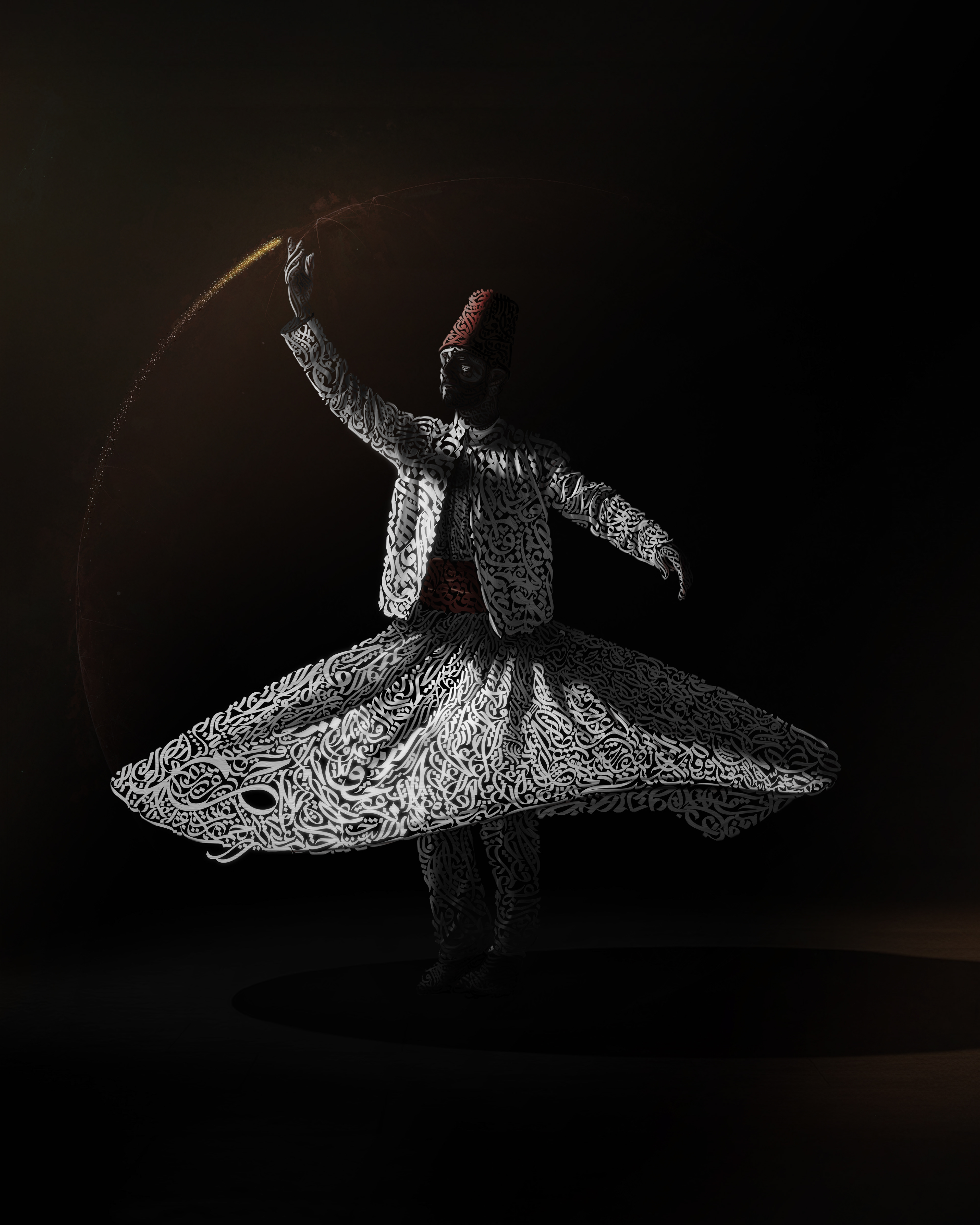 This artwork presents a mystical whirling dancer formed entirely from flowing Arabic calligraphy.